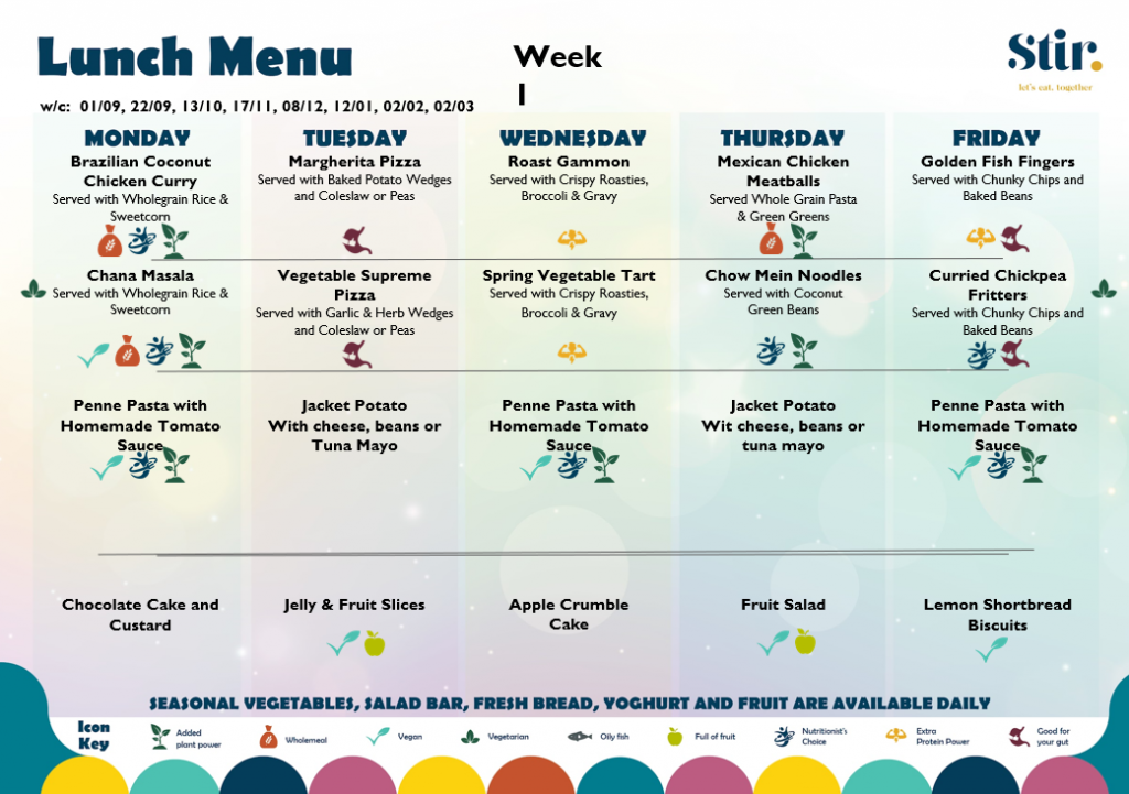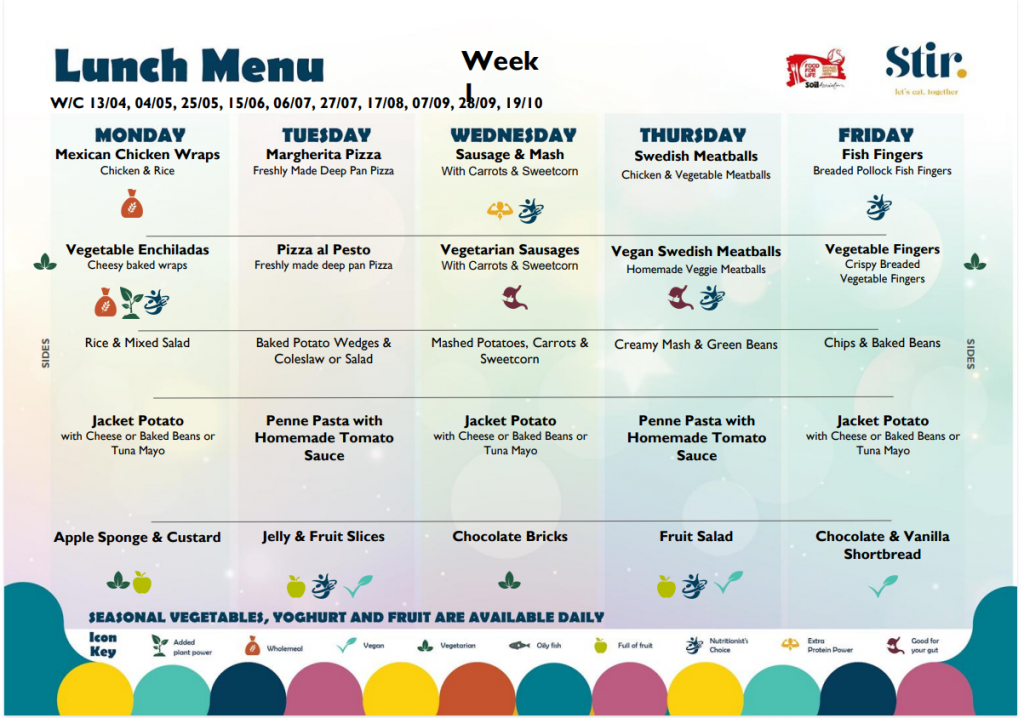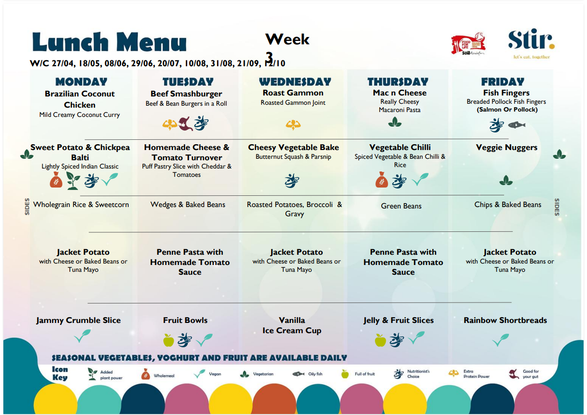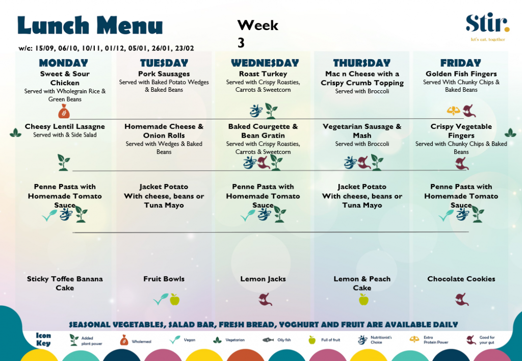The menu in place is on a 3 week cycle – copies are available at each office and on our display board at the main entrance.
